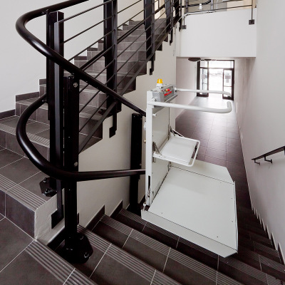 斜掛式輪椅升降平臺被設計應用在家居住宅和公共場所中的樓梯。它緊湊合理的折疊平臺可以在不使用的情況下輕巧的折疊起來,為樓梯節省足夠的空間,完全不影響他人的通行。是商用和家用無障礙輪椅通行的理想解決方案。升降平臺全自動運行無需人工干預,自動折疊、歸位;平臺即將到達/遠離著陸點時,自動減/加速;非接觸式及接觸式感應障礙物提前停止運行,障礙物移開自動繼續運行。